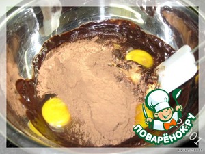 На водяной бане растопите шоколад, снимите с огня, добавьте сливочное масло и яйца, перемешайте все до однородной массы.
