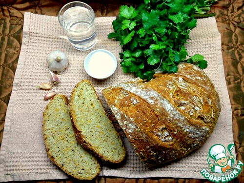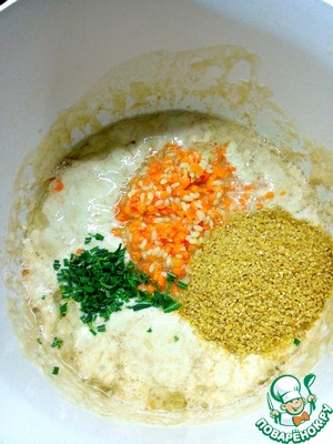 В готовую опару влить тонкой струйкой яблочный сок, теплую воду и 2 ст. л растительного масла, перемешать. Добавить распаренные рис и чечевицу, пшеничную крупу, соль, мелко нарезанную зелень и оба вида муки. Вымесить.