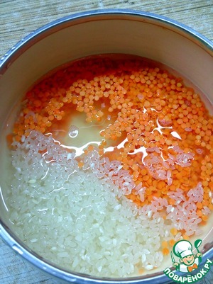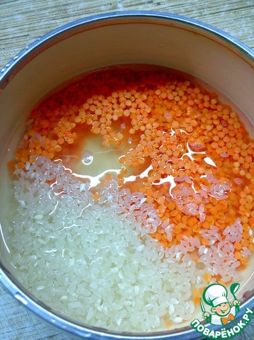 Рис и чечевицу промыть, залить 200 мл воды, довести до кипения, снять с огня, укутать и оставить на полтора часа. Пшеничную крупу промыть и просушить.