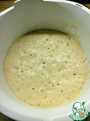 Сначала приготовить опару: воду с соком слегка подогреть. Перелить в миску, добавить мед и дрожжи, перемешать до растворения. Добавить просеянную муку, перемешать. Затянуть пленкой и оставить на час.