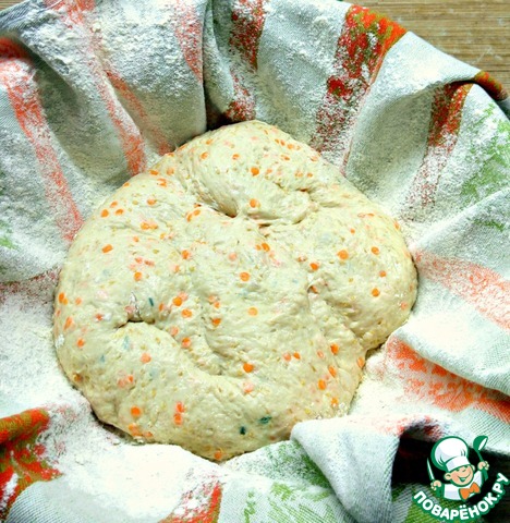 Придать тесту форму прямоугольника, края по бокам вытянуть в стороны и сложить к середине, затем поочередно вытянуть верх и низ прямоугольника и сложить к середине. Полотенце обильно посыпать мукой, завернуть в него тесто и оставить на 2 часа.