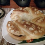 В середину кольца поместить шар из фольги. Смазать поверхность желтком, взбитым с молоком, посыпать миндальными хлопьями.