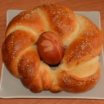 У меня жгуты длиннее, чем 40 см. получились, венок я сплела, подровняла, так и оставила. В серединку вообще ничего не клала. Посмотрела, что места предостаточно, даже если учесть, что тесто ещё подойдёт.