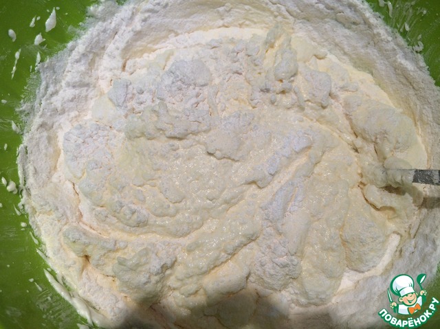 Частями ввести муку с сухими компонентами и аккуратно перемешать тесто.