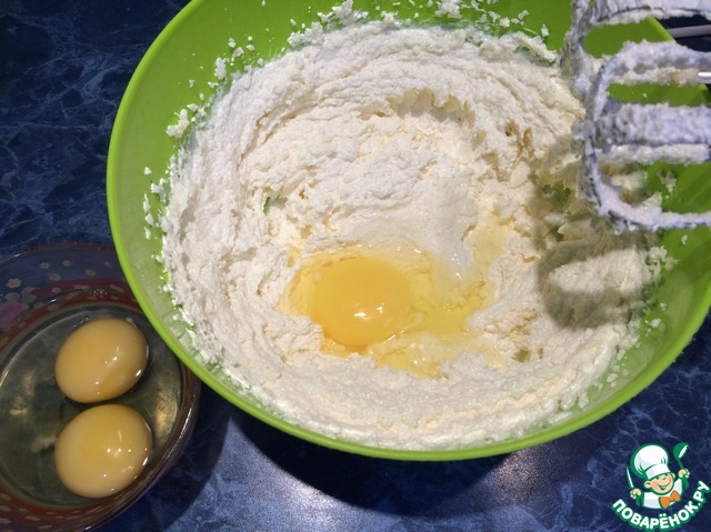 Добавить частями сахар, продолжая взбивание. Затем по одному ввести яйца.