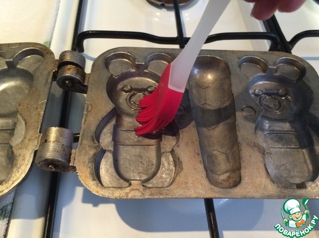 Заполнить тестом на 2/3 объема только одну сторону формы. Для удобства я это делаю кулинарным мешком, очень быстро. Закрыть и печь на медленном огне минут 8-10, переворачивая форму для равномерного пропекания. Повторно смазывать форму уже не нужно.