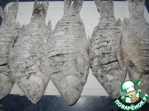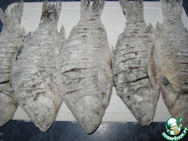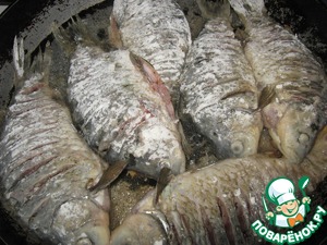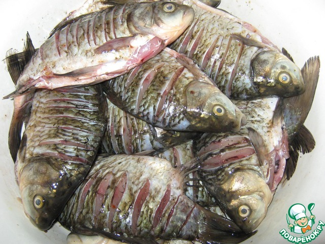 Карасей тщательно почистить от чешуи и внутренностей, убрать черную пленку, помыть. Сделать надрезы острым ножом. Посолить, поперчить |