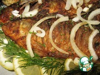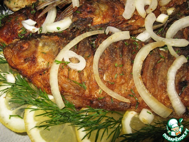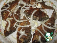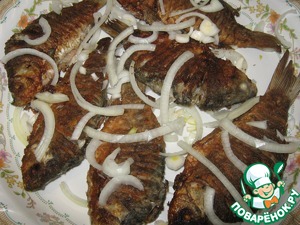 Выложить карасей на лук и сверху слегка посыпать луком. |