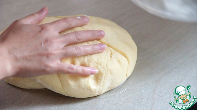 Перекладываем тесто в миску, присыпаем мукой. Накрываем его плёнкой, полотенцем и оставляем в тёплом месте подниматься где-то на час.