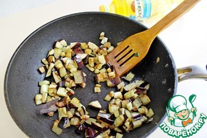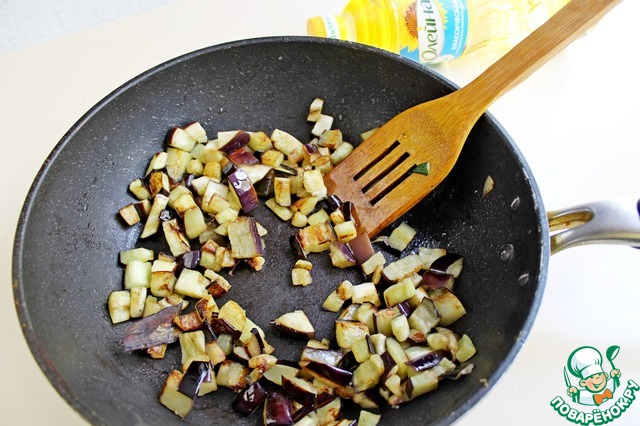 В эту же сковороду налить 2 ст л растительного масла "Олейна" и обжарить нарезанный на кубик баклажан.