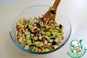 Цуккини или кабачок нарезать на небольшие кубики и обжарить на 1 ст л растительного масла "Олейна" до румяности. Присолить. Выложить в салатник.