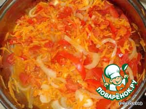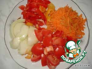 Лук и перец порезать полукольцами, помидоры крупными кубиками, морковь потереть на крупной терке. Все перемешать.
