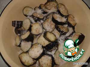 Баклажаны нарезать кусочками толщиной 5мл, посолить и дать постоять.