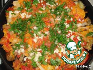 Готовые баклажаны сложить в кастрюлю, на них положить поджаренные овощи, далее нарезанный чеснок и мелко нарезанную зелень. Накрыть крышкой, поставить на очень тихий огонь и тушить 10 минут. Готовое соте перемешать.