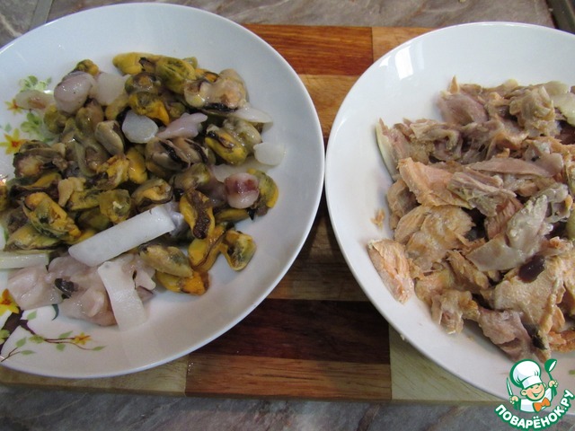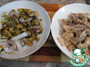 • Остужаем головы. Выбираем мясо. Бульон процеживаем.