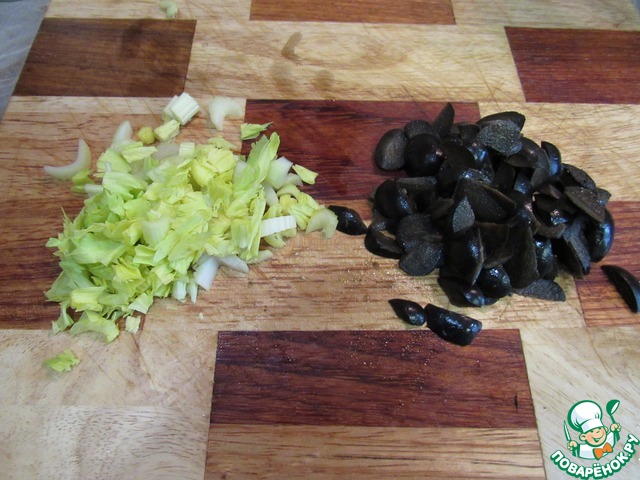 • Пока закипает суп, мелко режем сельдерей вместе с листьями и оливки. (Если оливки с косточками, то их нужно предварительно удалить.)