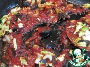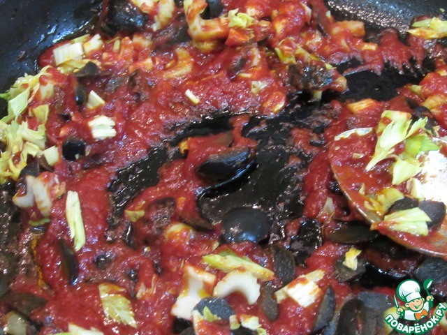 • На отдельной сковороде разогреваем оливковое масло. Обжариваем сельдерей и оливки. Добавляем томатную пасту, бальзамический уксус, немного бульона и протушиваем несколько минут. Выкладываем нашу зажарку в суп.