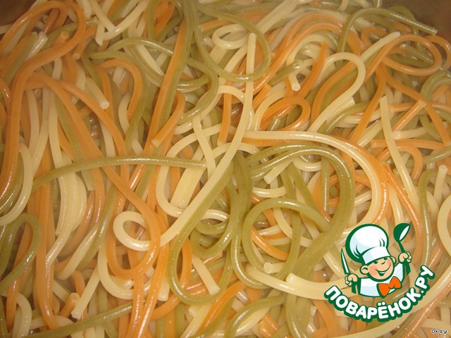 Сварите макаронные изделия в подсоленной воде, слейте воду и перемешайте с растительным маслом.