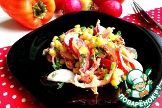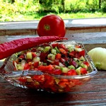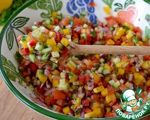Рецепт этого простого овощного салата нашла на просторах интернета! )) Изначально привлек внешний вид салата (такой яркий и весенний), но и по вкусу он нам очень понравился - сочный и свежий! Можно есть в качестве салата, а можно подать в качестве сальсы ко всевозможным лепешкам, лавашу, крекерам, к мясу...