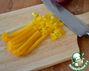 Затем разрезать пополам и удалить семена у сладкого перца, нарезать полосками и также на маленькие кубики. Стараемся нарезать все овощи одинаково размера.