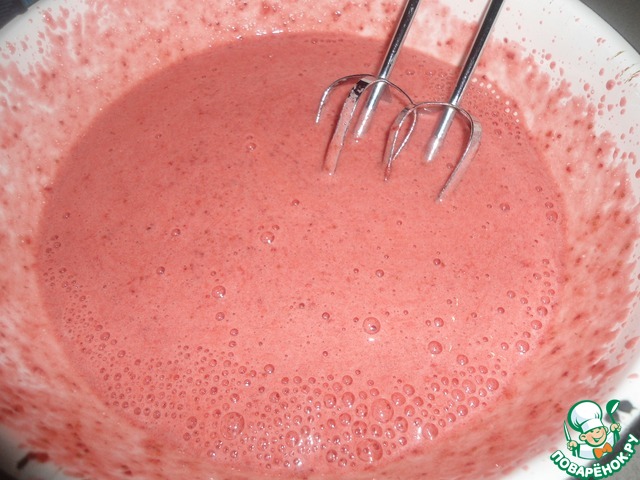 Вливаем разведенный желатин в клубнику, и взбиваем миксером, пока обьем не увеличится в 4 раза (у меня это заняло примерно 7 мин). Далее выливаем мусс в форму застеленную пленкой и ставим в холодильник для полного застывания