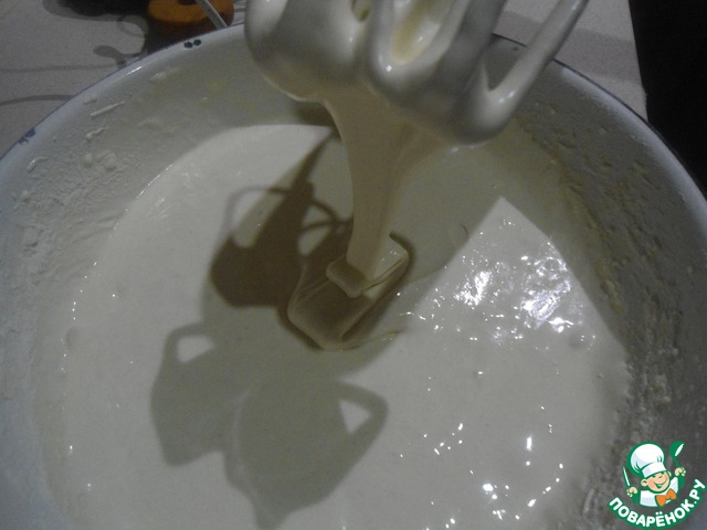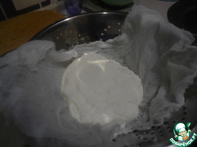 Тем временем займемся кремом. Сметану, предворительно, я вылила в марлю и положила в сито, для того чтобы стекла лишняя сыворотка, оставив на ночь в холодильнике