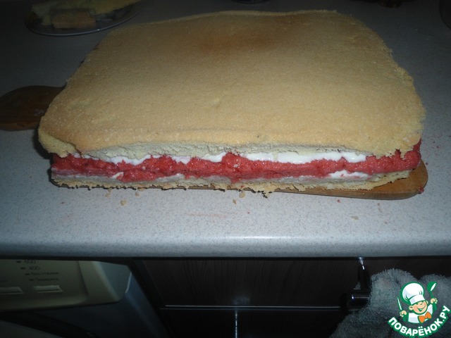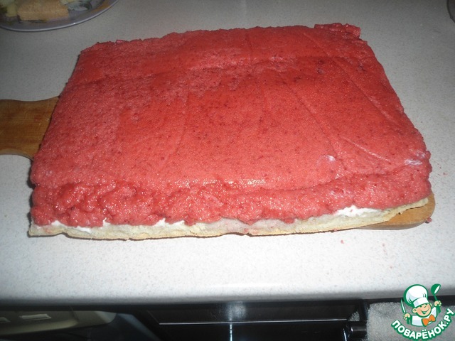 Бисквит разрезаем на два коржа, и обрезаем неровные края. Первый корж пропитываем клубничным сиропом и смазываем кремом. Достаем наш мусс и аккуратно с пленки переворачиваем его на корж