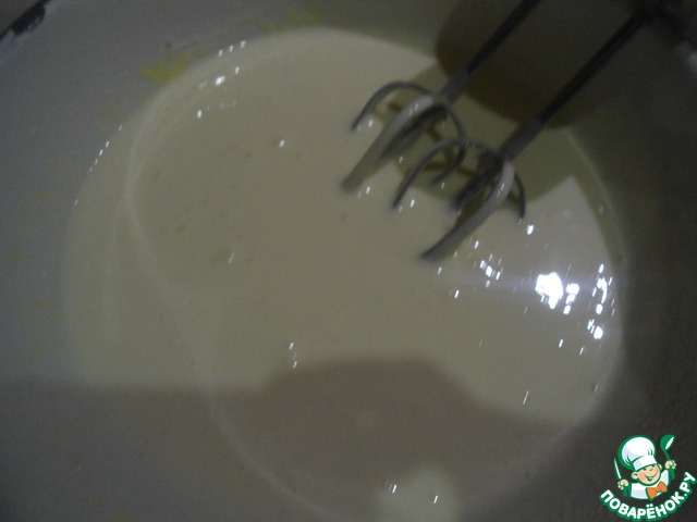 Продолжаем взбивать на маленькой скорости и в три приема добавляем муку, и щепотку соды не гашеную