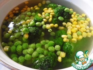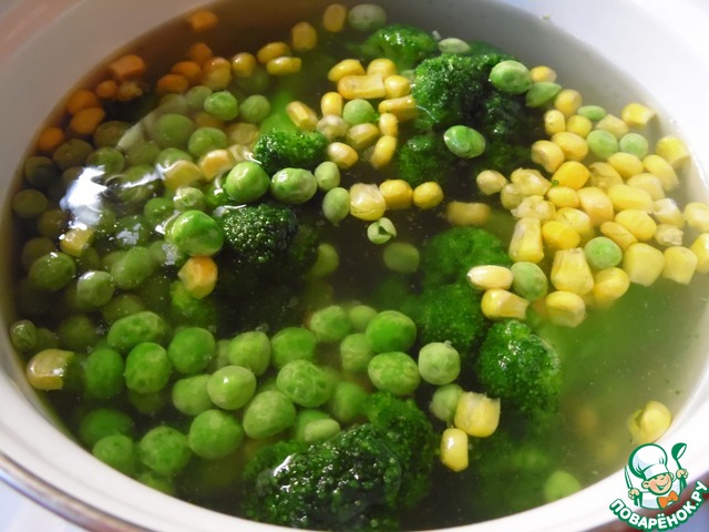 Брокколи разобрать на соцветия, вместе с кукурузой и горошком отварить в кипящей подсоленной воде 3–4 минуты.
