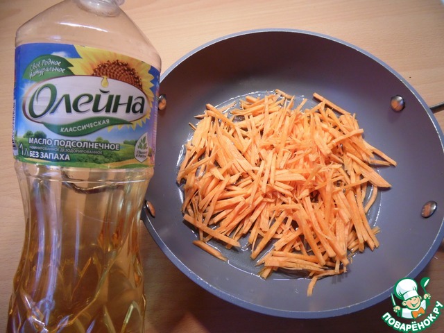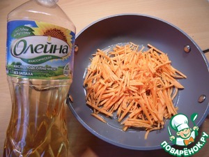 Морковь нарезать соломкой, добавить соевый соус, обжарить на растительном масле ТМ "Олейна" 2–3 минуты.