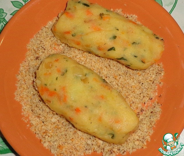 Сформировать картофельные палочки и обвалять в панировке. Обжарить с двух сторон до золотистого цвета на подсолнечном масле.