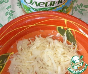 • Нашинковать капусту, хорошо размять руками, чтобы капуста стала мягче и сочнее.