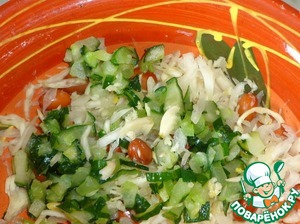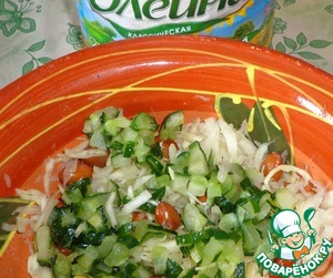 • Свежий огурец мелко порезать. Добавить к капусте, перемешать.