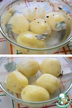 Картофель залить водой, добавить соль, лавровый лист и перец-горошек. Сварить до готовности.