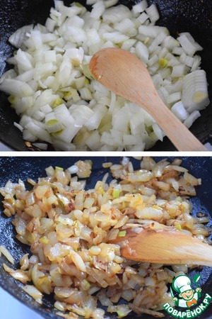 Лук мелко порезать и обжарить на растительном масле до золотистого цвета.