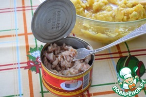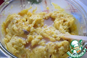 В пюре добавить обжаренный лук, яйца, сливочное масло. Перемешать.