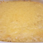 Выкладываем в форму (у меня керамическая Ø 29 см), разравниваем и посыпаем тертым на крупной терке сыром. Я ставлю форму в холодную духовку, задаю температуру 180°С и запекаю 40 мин.