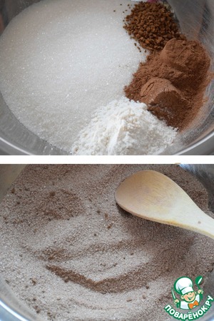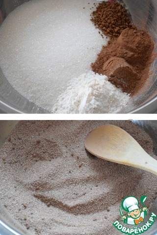 В ковшик или чашку высыпать сахар, добавить муку, какао, кофе, ванилин и хорошо перемешать.