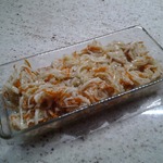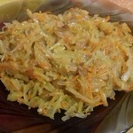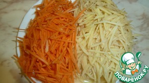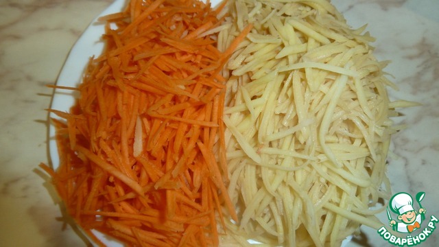 Почистить овощи, помыть и обсушить. Картофель и морковь натереть на тёрке для корейского. Лук порезать полукольцами.