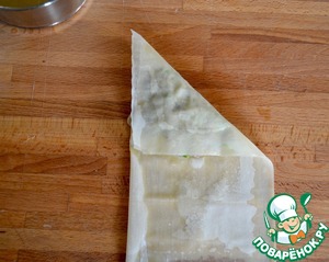 "Пирожок" готов! То же самое проделайте со всеми остальными самосами, до окончания ингредиентов. Не забывайте смазывать обильно растопленным сливочным маслом каждый лист...