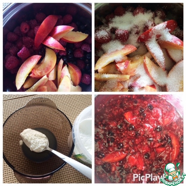 Укладываем в сотейник ягоды и порезанные персики, пересыпаем сахаром, у меня буквально две ложки. Оставляем минут на 15, ягоды пустят немного сока, в случае если они свежие. Если же ягоды замороженные можем сразу же приступать к следующему действию, т. к. ягоды начнут от тепла размораживаться и пустят сок.