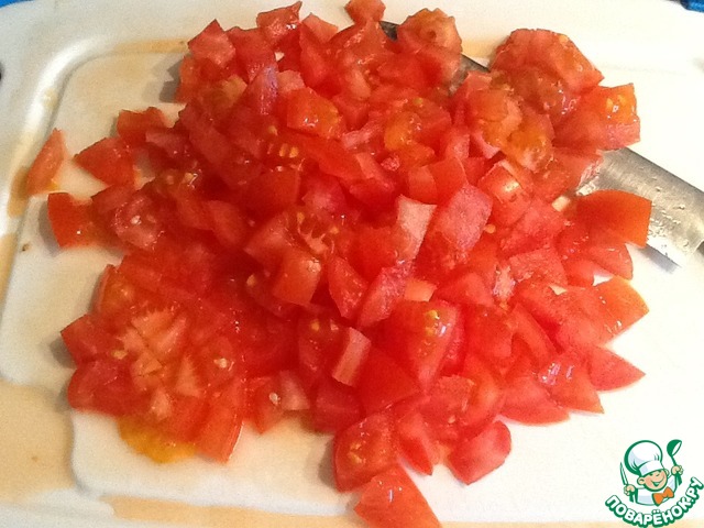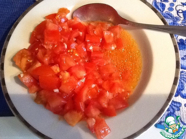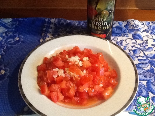 Тем временем, помидорка дает свой сок, который смешивается с ароматами чеснока и оливковым маслом. Вот собственно это и есть наша заправка.