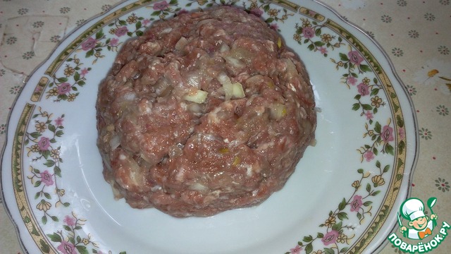 Теперь переходим к мясу. Из мяса делаем фарш, добавляем нашинкованный лук ( при желании его тоже можно пропустить через мясорубку). Добавить в фарш яйцо и соль, перец по вкусу. Перемешать.