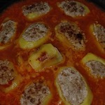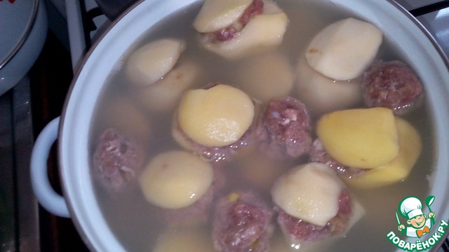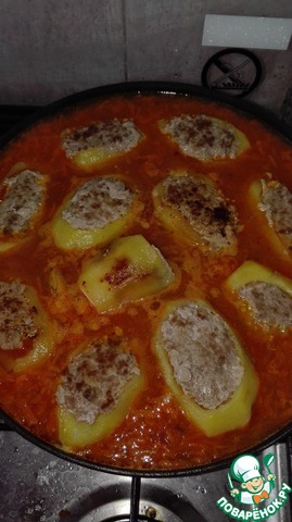 Поставить греться воду чтобы был под рукой кипяток. Начинить картошку фаршем. И положить в кастрюлю, прикрывая "крышечками " (крышечки немного прижимать)
