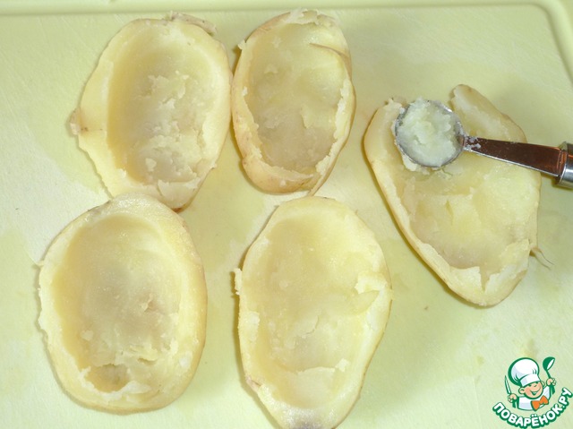 Разрезать клубни вдоль и аккуратно вытащить середину при помощи специальной ложки или обычной чайной так, чтобы половинки картофеля напоминали лодочки.