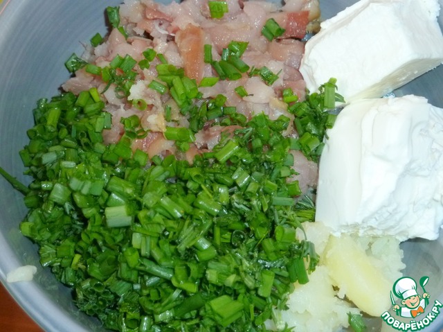 Смешать мякоть картофеля с творожным сыром, кусочками филе скумбрии, мелкорубленной зеленью -