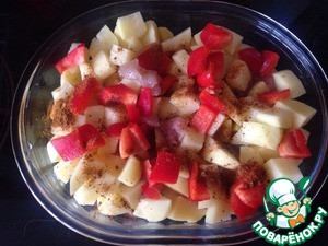 Нарезаем средними кубиками куриную грудку и перец, затем мелкими кубиками картофель. Так как, картофель запекается дольше курочки, поэтому стараемся сделать поменьше кубики. Смазываем противень растительным маслом и выкладываем наши нарезанные ингредиенты. Посыпаем острыми специями.