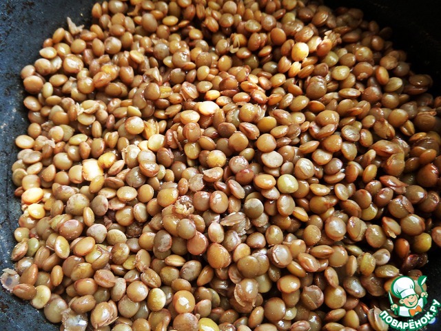 Чечевица сварена, лишнюю воду сливаем. Чечевицы может уйти на салат меньше данного количества. Дело вкуса.