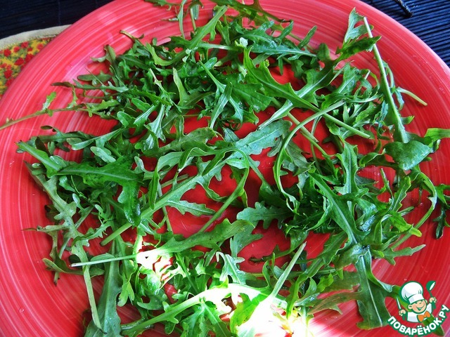 Рукколу промыть, просушить и разложить на дно большого блюда.