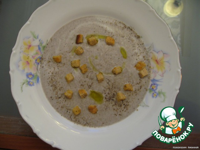 Разливаем порционно и заправляем оливковым маслом, черным молотым перцем и гренками.